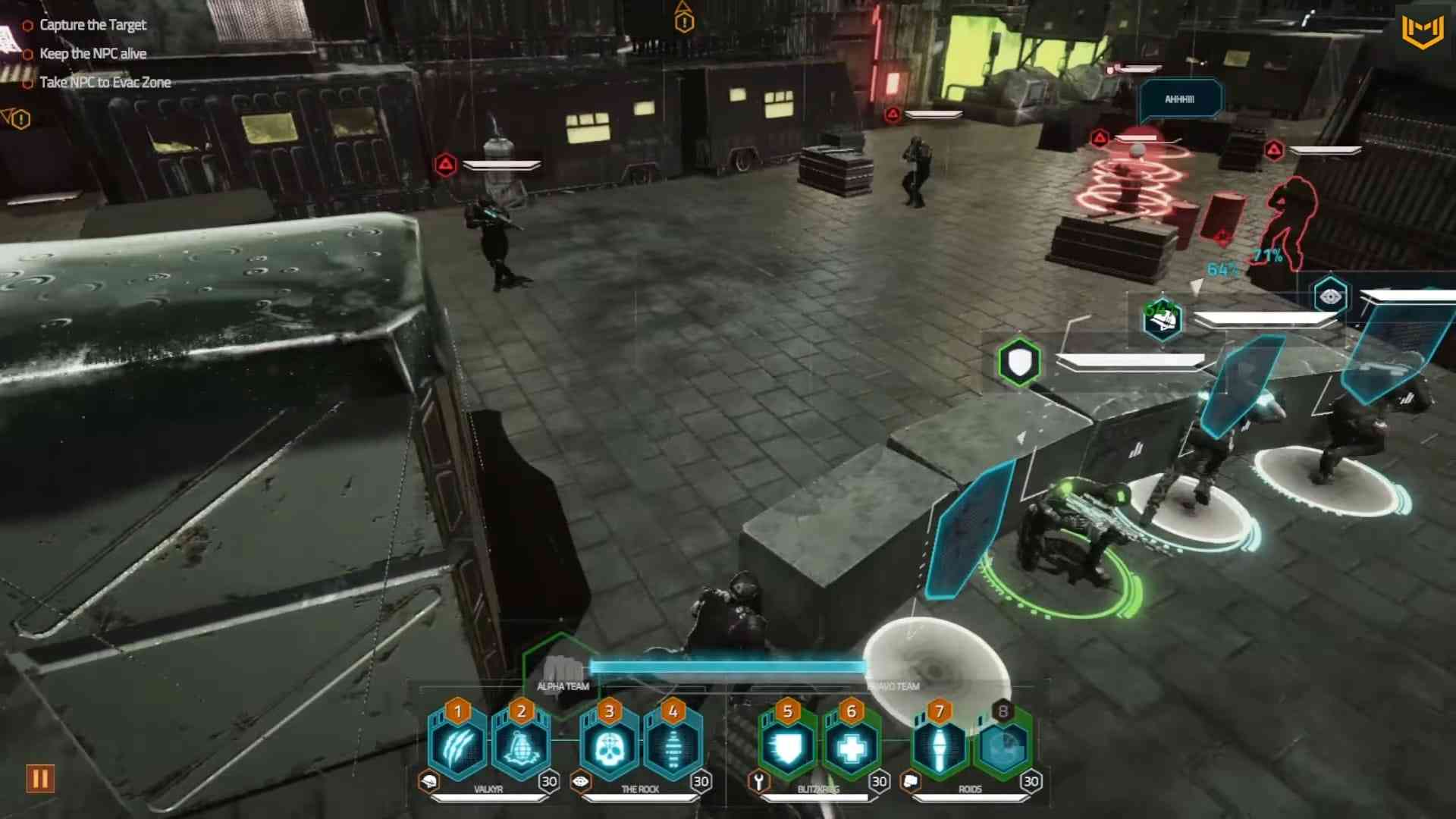 At this stage in development, players have access to the game’s first major story chapter. It’s a rain-soaked slum with some nice particle and lighting effects. Anti-establishment slogans are sprayed onto tin walls, empty shops still have their signs lit up. There’s a gritty sci-fi aesthetic that’s captured nicely. There are a handful of main story missions to complete, along with a steady stream of side missions. These come in a variety of flavors that mostly boil down to killing or capturing someone. Your various bosses are in a power struggle, something M.E.R.C. illustrates with a reputation system. Unfortunately, the consequences for angering or appeasing any given overlord are not currently apparent. If I do enough missions for the bank, do I lose missions from the bio-tech guys? If there are consequences like that, they aren’t touched on directly.