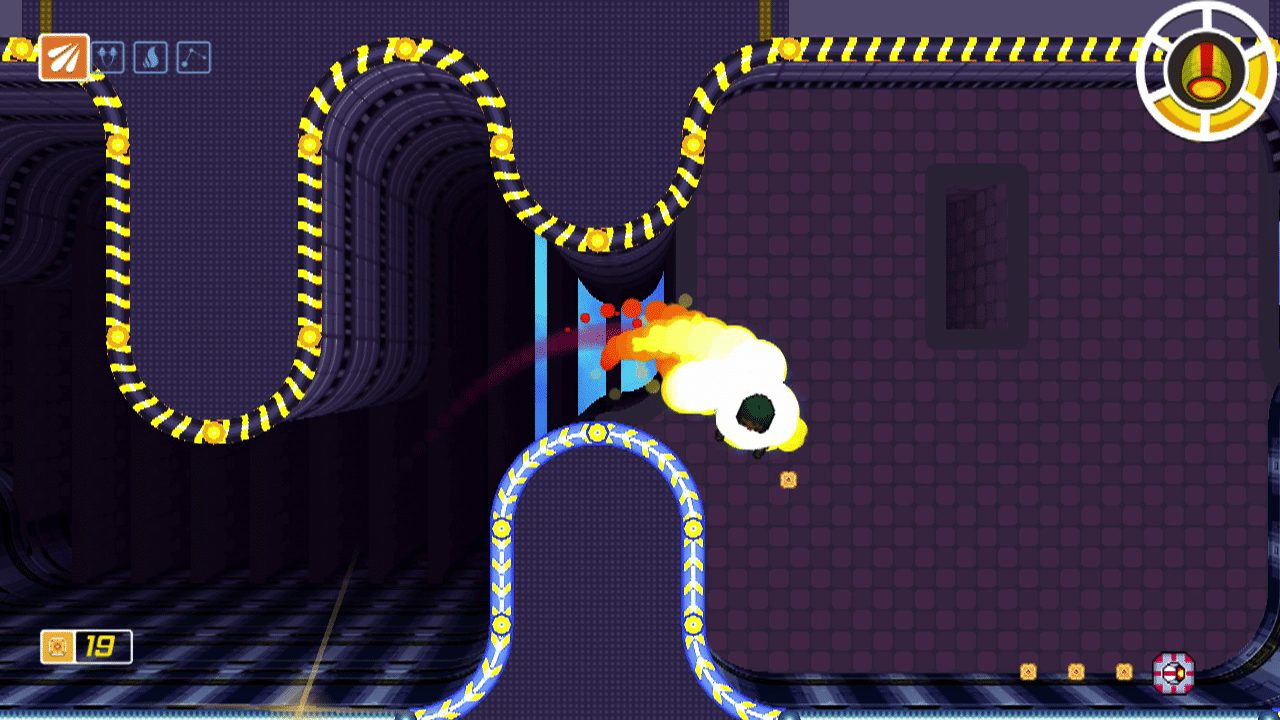 The combat in both the adventure and challenge modes is simple enough and it’s the game’s greatest hook and also its greatest flaw. You move along rails and are only capable of shooting straight forward. This means that in order to fire at enemies coming at you from an angle you either need to ignore your survival instincts and move straight into their line of fire or run away and find a place where the wall bends. This restriction will often times cause needless complication. Enemies will swarm you at all different angles, making it near impossible to avoid getting hit. On the upside, you aren’t completely glued down. You can jump off the rail at any point, and will be pulled back in by a gravitational effect. In addition to your standard jump, there is a sort of super jump that turns you into a big ball of fire. This is used in many places to break through barriers and can be used to kill baddies. Jumping also allows for you to switch to any adjacent track in range. Many missions feature weapon upgrades, such as giant purple laser beams. Cats in space need lasers after all.