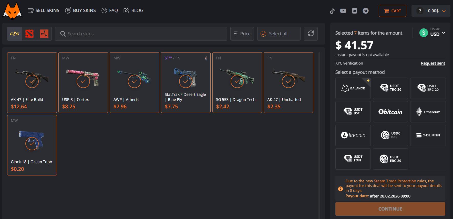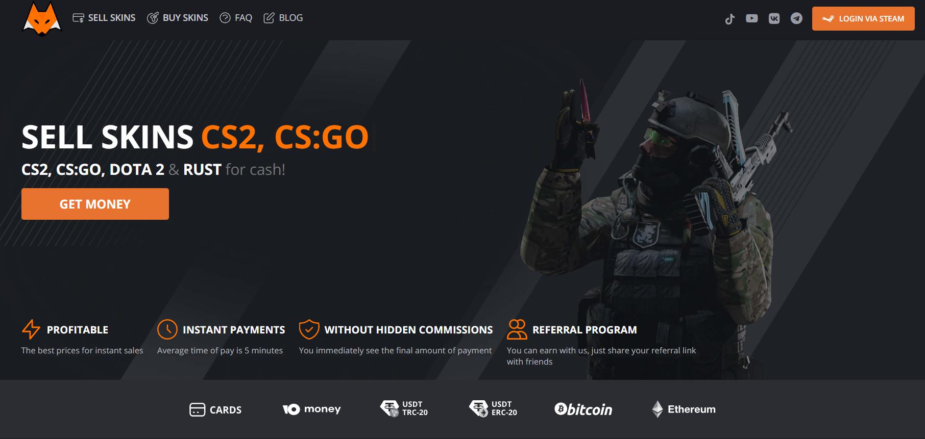Multiple Payout Methods: Choose from a wide range of withdrawal options, including the ability to sell CS2 skins for crypto quickly and securely.