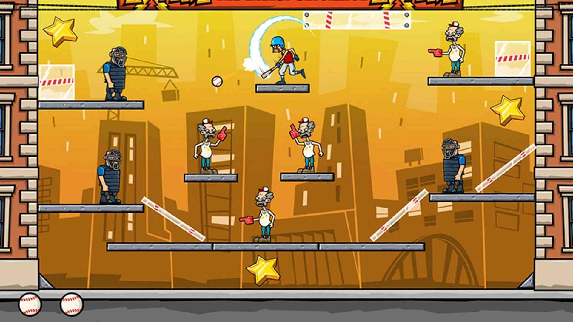 Each world introduces a new type of bad guy and many of the bad guys bring an added challenge. For example, fans have no protection, so you can hit any part of them whereas umpires are protected from the front, so you’ll need to hit them specifically from behind. In addition, other obstacles will appear throughout the game, such as glass, tires, and exploding barrels that’ll get in your way. The game does become quite challenging at times, but you’ll be able to replay a level as often as you like. Sometimes it just takes a lot of trial and error, figuring out what angles will produce what results.