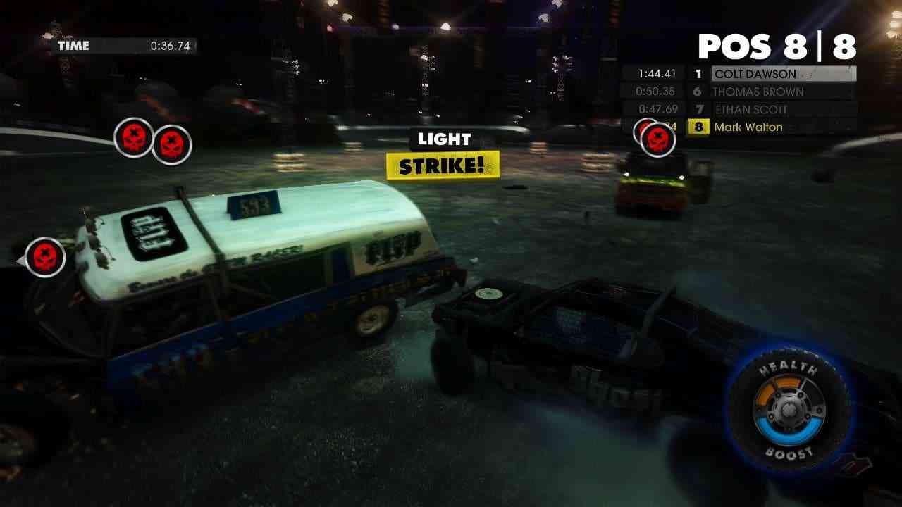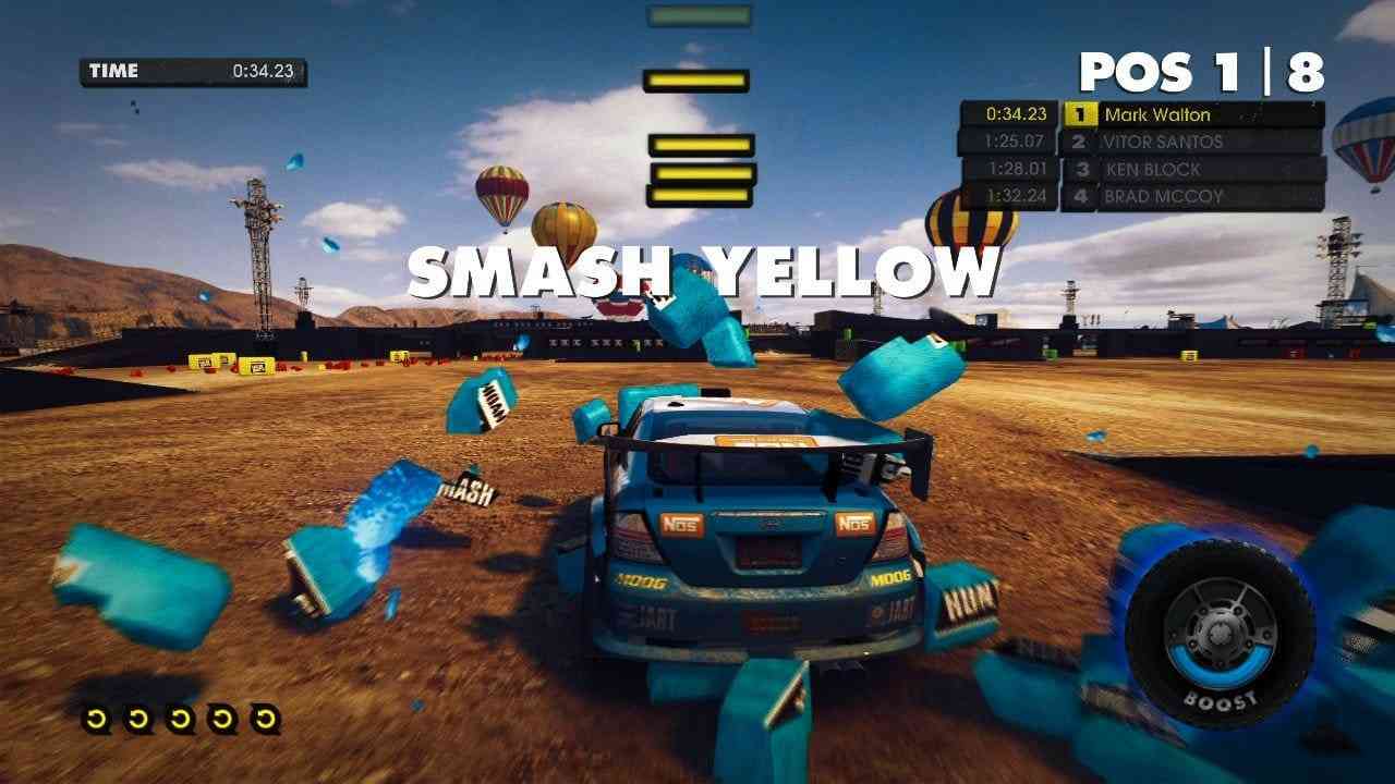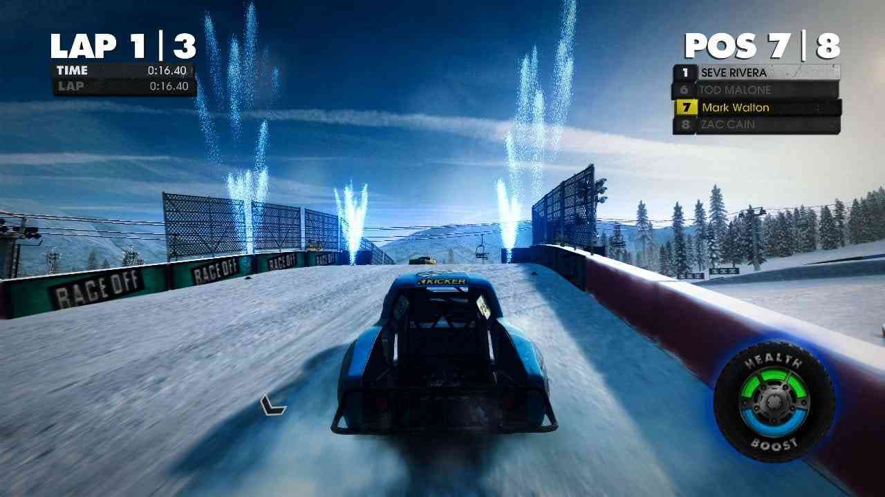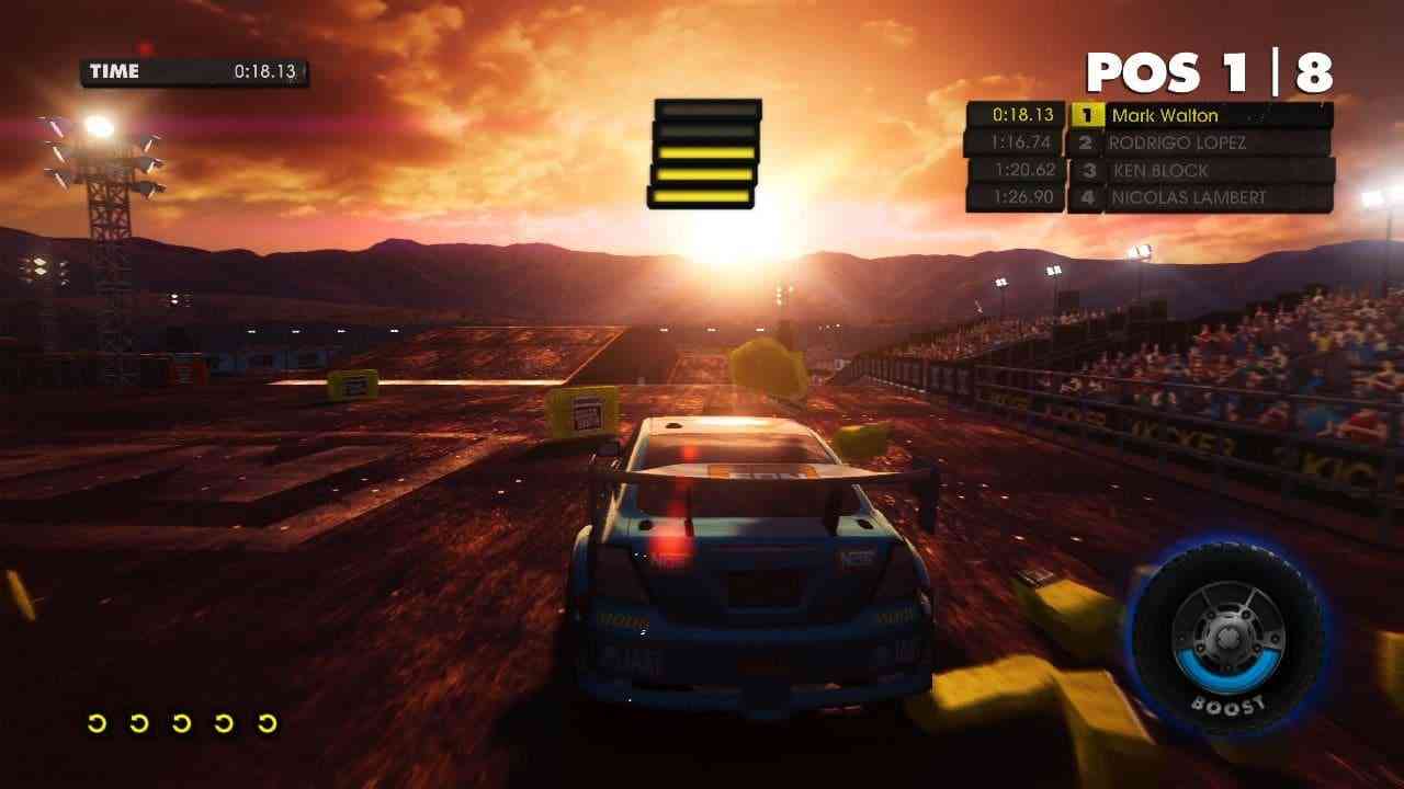First and foremost, Dirt Showdown is by far the most arcade oriented game of Codemasters’ offerings to date.  Unlike its predecessors, Showdown does away with rally style events and focuses on the gymkhana and head-to-head event types.  Purists might see this as cause for concern but you should not go into this game expecting a sim-like experience.  The action in Showdown is as much about crashing and smashing as it is about racing.  Not only is taking other cars out a perfectly acceptable tactic, it is encouraged (as demonstrated by the introduction of both health and boost meters on your screen).