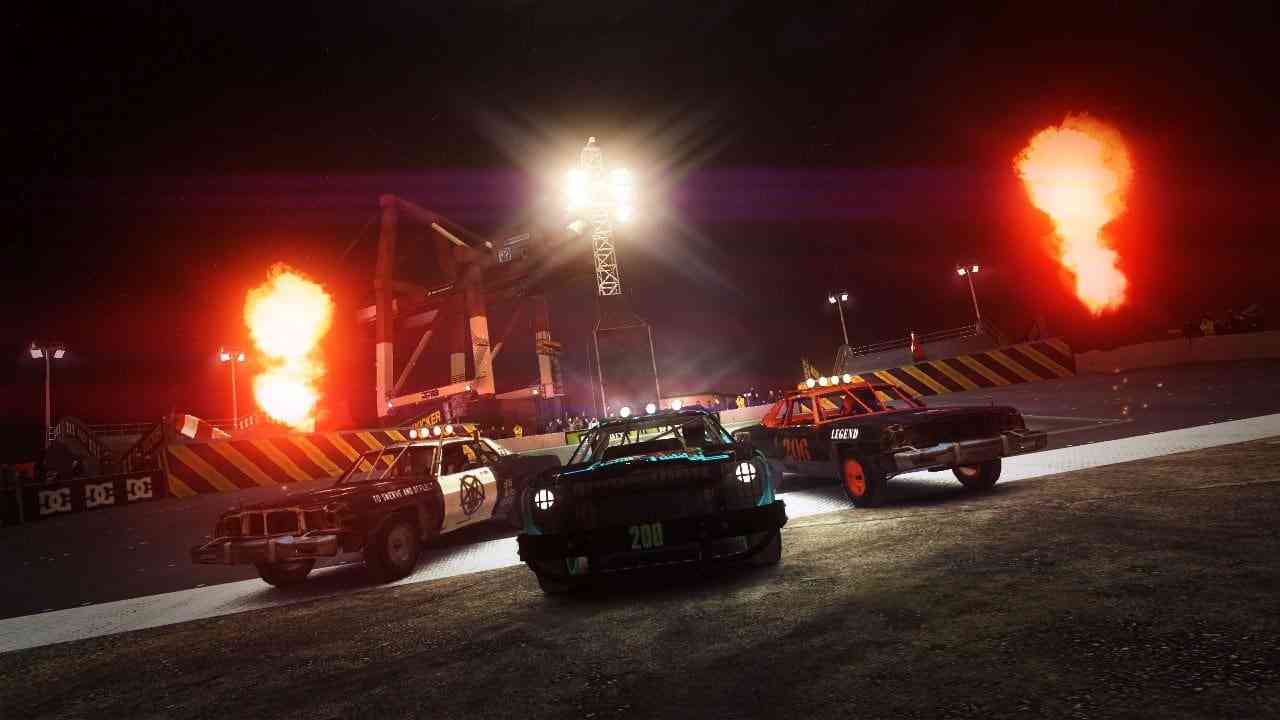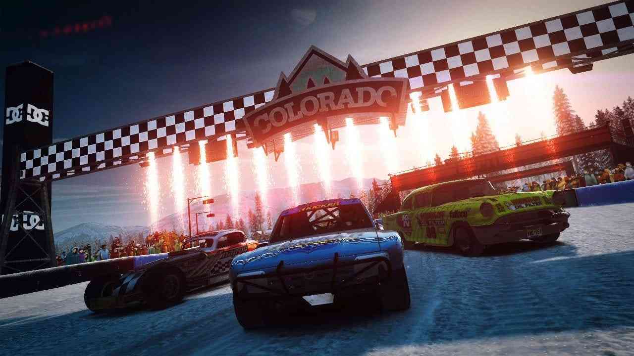 Generally speaking, Codemasters racing games are some of the best looking racing games in the market.  Thanks to their lighting model, Dirt Showdown does not disappoint in the visuals department.  Complementing the over-the-top action is its equally over-the-top look.  An ultra-bright colour palette contrasts starkly with other rally and racing games.  Around every turn there are neon colours, flashbombs and fireworks.  There are only two viewpoints this time: a hood view and a behind-the-car view.  There are no dashcams in this game and that suits me just fine.  In a game all about carnage the third person viewpoint seems like the right decision.  As good as the cars look they look better damaged.  Your car never stays clean and unscathed for long with smashing and crashing being the name of the game.  It isn’t Burnout level of destruction but what’s there looks excellent.  No matter the amount of cars, action or pyrotechnics going on on-screen the action stays fast and smooth.