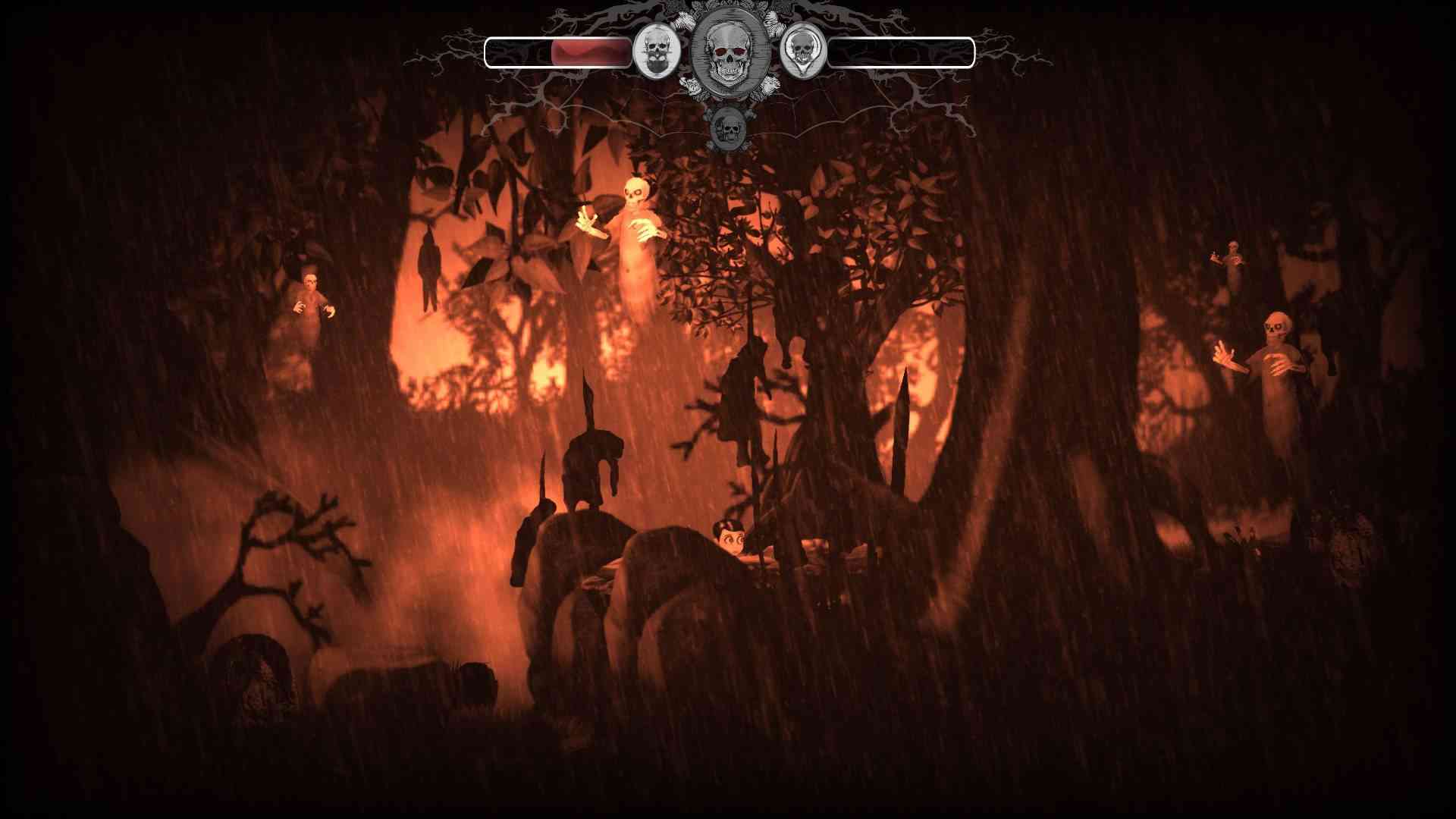 Unfortunately, the artwork alone is not enough to carry the game past its glaring mechanical issues. There are few actions available besides jumping, running, and the unlockable powers — which, to their credit, are actually pretty cool. For example, the first unlockable power is a mode that alters reality to transport the player to a different paradigm: meaning the nature of the puzzle is changed and certain objects, enemies or platforms may or may not exist in the alternate universe. This new universe is orange-toned and exceptionally creepy, with floating ghost cultists and dead bodies impaled on spikes being a regular sight.