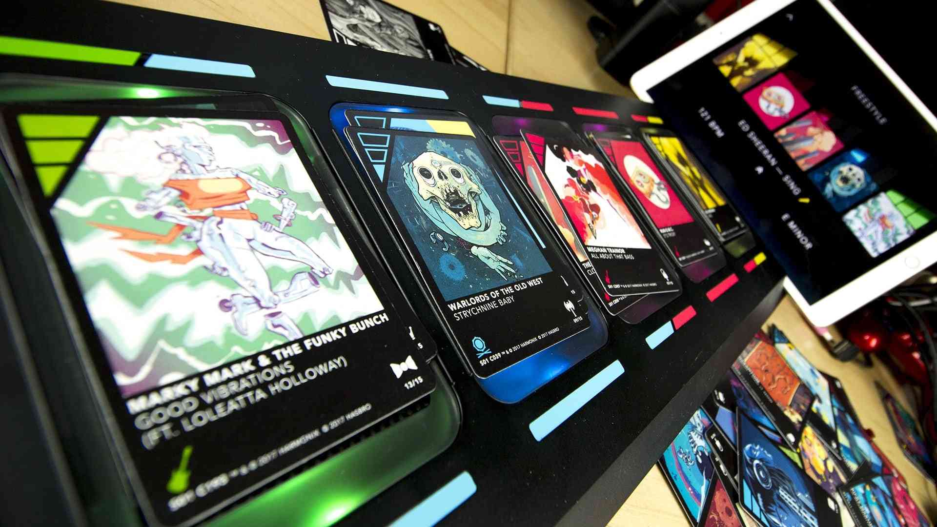DropMix comes with the electronic game board and 60 cards (4 different themed decks) and simply hooks up to your tablet or mobile device via a downloadable app. From there, the app lets you simply jam out mixes or play a couple of different games. Before we get into that though, let’s give you a quick overview of how it all works. Each card represents a different song with beats, rhythms, harmonies, vocals and more. Some cards are Wildcards that can be played in any slot on the board offering up multiple song parts and there are FX cards as well that add well… FX. Using a color-coded system you drop cards onto the board and insert different points of songs as you go. What happens next is pure magic as songs start building on top of each other creating insane mixes that sound a lot better than you might anticipate. It’s addictive simply to come up with your own unique mixes in different tempos and keys and quite honestly, it can keep you going for hours. That’s the meat and potatoes of it all.