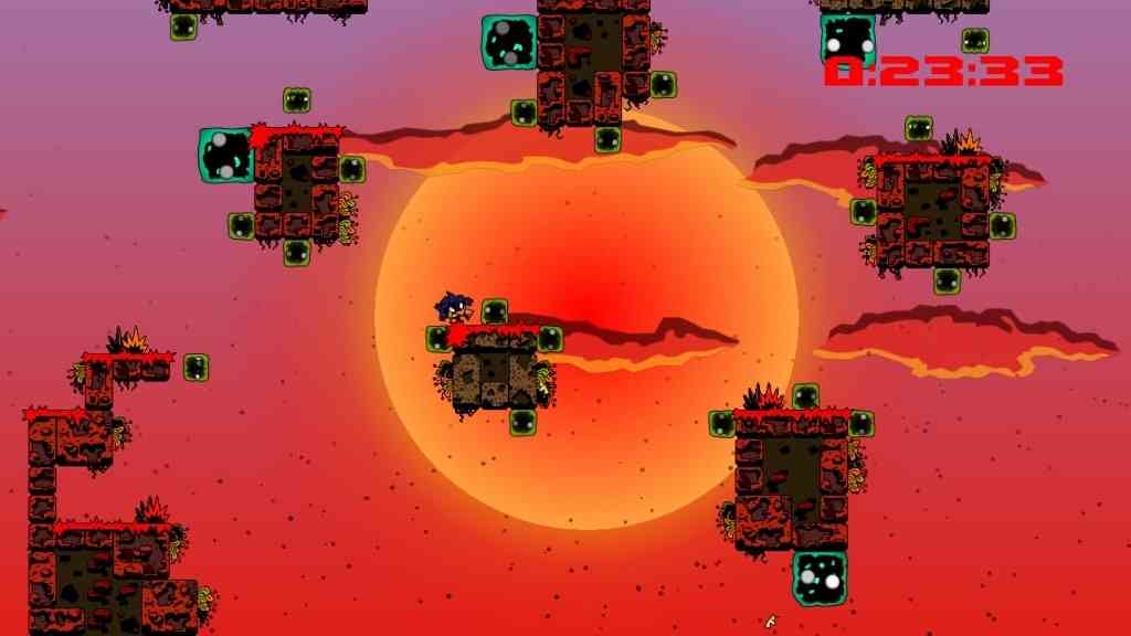 The similarities go on. There are optional objectives in each stage. In Fenix Rage they’re cookies instead of bandages, but the implementation is exactly the same. Each group of about 20 stages makes up a world. The stages in a world are tied together by a unique aesthetic to that world. Each world ends with a short, cute little cutscene before some form of boss fight to cap things off. Sound familiar? Sounds just like Super Meat Boy.