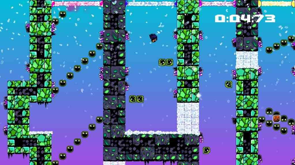 The primary mechanic is the infinite jump. Think of it basically like a double-jump, but infinitely. Through a series of small hops chained together you can basically fly. Also, instead of a run button you have a short dash button, which you can also chain together to zip horizontally across an entire level without ever touching the ground. These mechanics make a meaningful difference. As opposed to the rhythmic running, jumping and wall-sliding of Meat Boy, the challenge in Fenix Rage comes from staying airborne and fitting into tight places with precision.