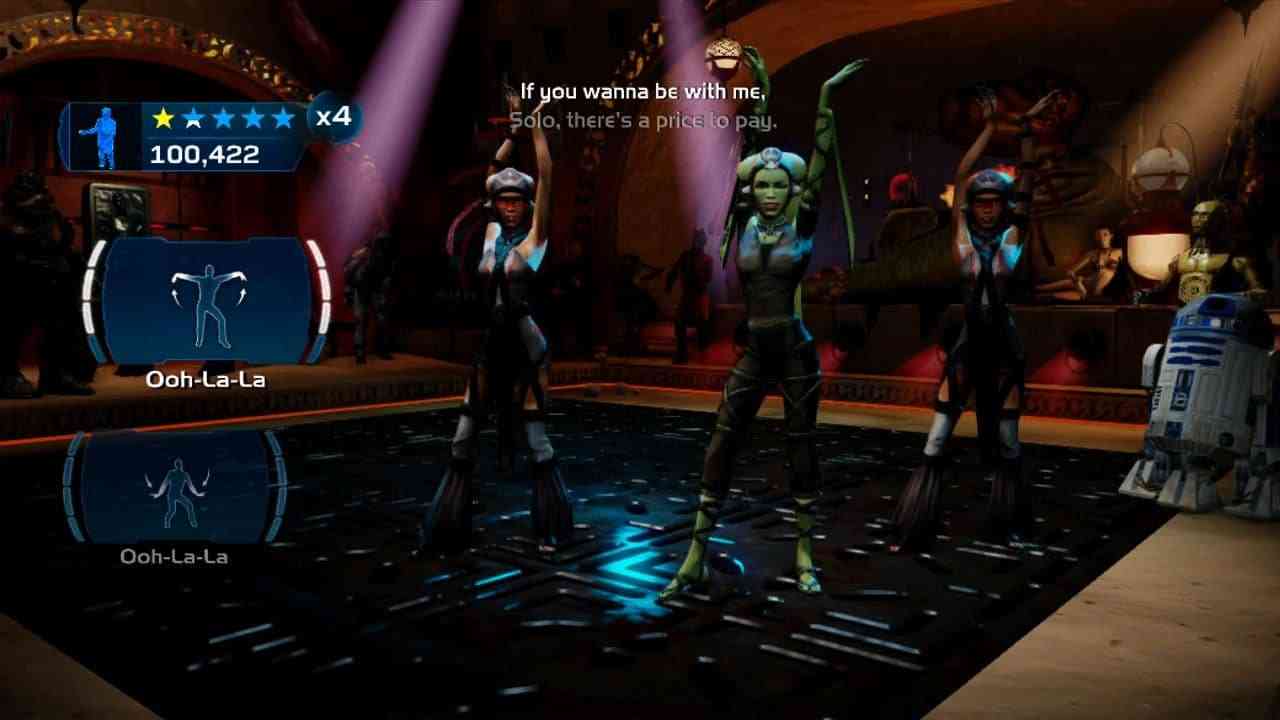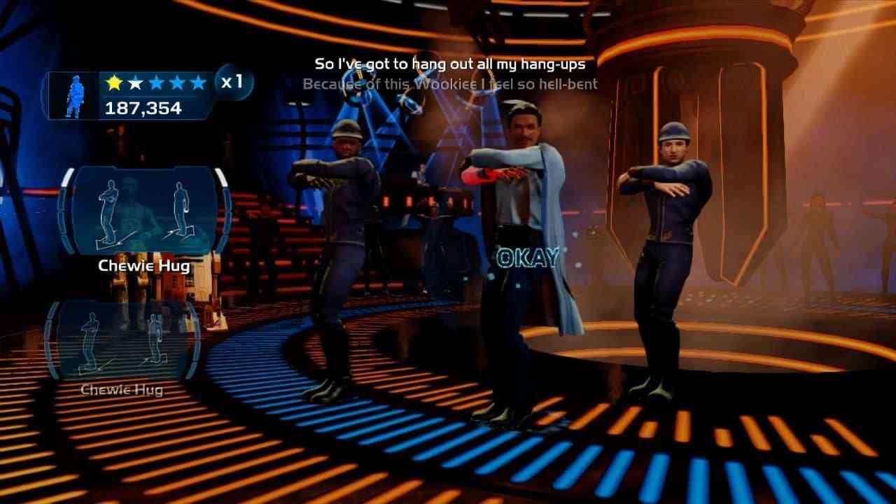 One of the biggest surprises of Kinect Star Wars is the dance mini-game called Galactic Dance Off.  Yes, you heard me right, a dance mini-game in a Star Wars game.  I was somewhat mixed to this.  Being that I saw the original Star Wars in the theatre in 1977 as a young child, to say that I have been a fan of the movies is an understatement.  To see storied characters such as Han Solo and Princess Leia busting a move and grinding away on screen was somewhat disturbing.  That being said, I was somewhat amazed with how well the mechanics of the dance mode worked as a game.  The Kinect was responsive in registering my dance moves, and when I found myself having the wrong rhythm, my on-screen character highlighted the area I was having difficulty with in red (e.g. my limbs glowed).  As you earn points for being ok, good, or perfect in your moves, you earn points and these points accumulate towards a star rating.  The higher star ratings open up new levels and songs.  Speaking of songs, each song is based off of a popular pop song that has had its lyrics “Star Wars-ized”, so although the song sounds familiar the words are all Star Wars based.   They actually don’t sound too bad either.  Overall this mode is somewhat enjoyable, and once you get past the fact that it’s all your favourite Star Wars characters getting “jiggy with it”, you may just have some fun here.
