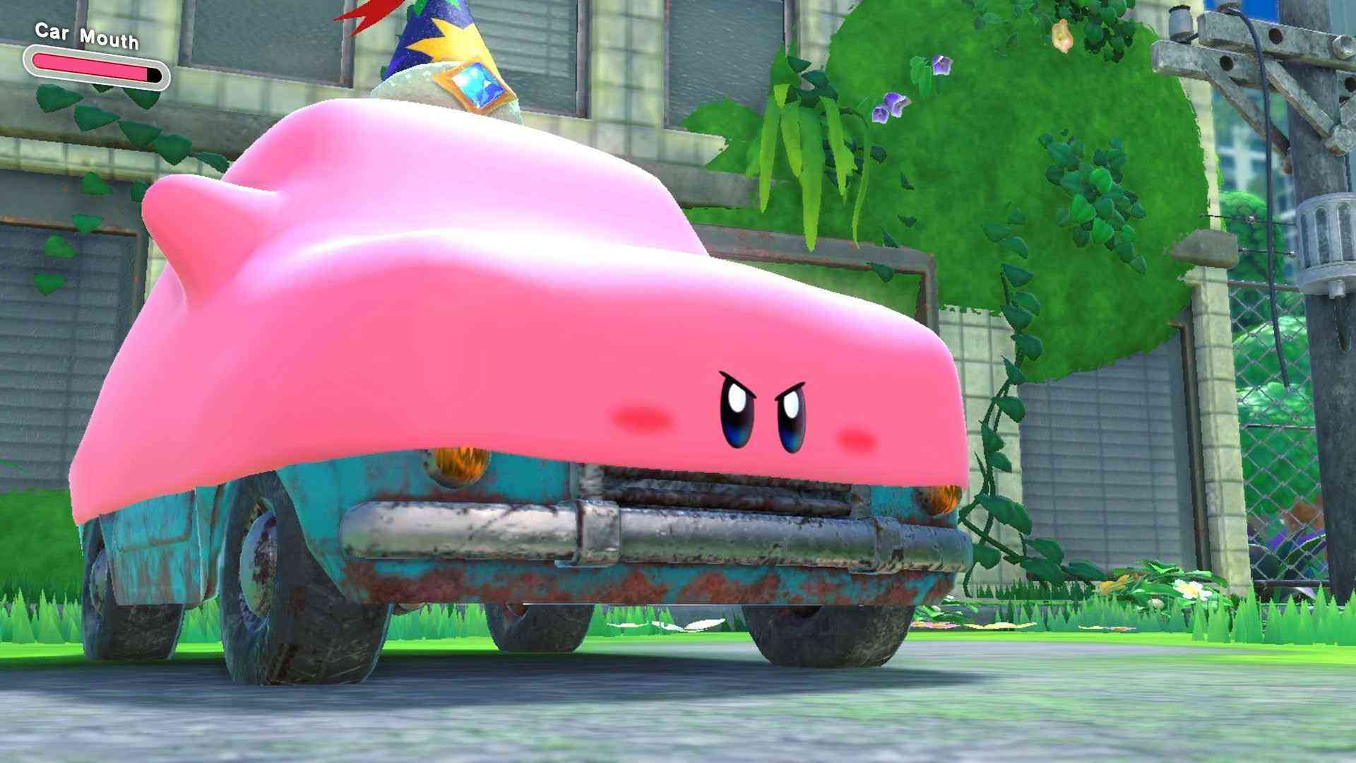 You won’t win any key battles by turning into a staircase, but Mouthfuls are still a big part of Forgotten Land. Using these weird transformations gets you through tons of tricky puzzles. Traversing terrain, blowing through barriers, and tackling tough opponents are all possible with this new technique. Sure, stretching Kirby over a rusted hatchback looks unsettling, but then you’re off to the races! Somehow. Does he steer with his tongue? Or is some other internal organ threaded through the wheels? Other less disturbing objects include vending machines, giant rings, safety cones, and the aforementioned stairs. So many possibilities!