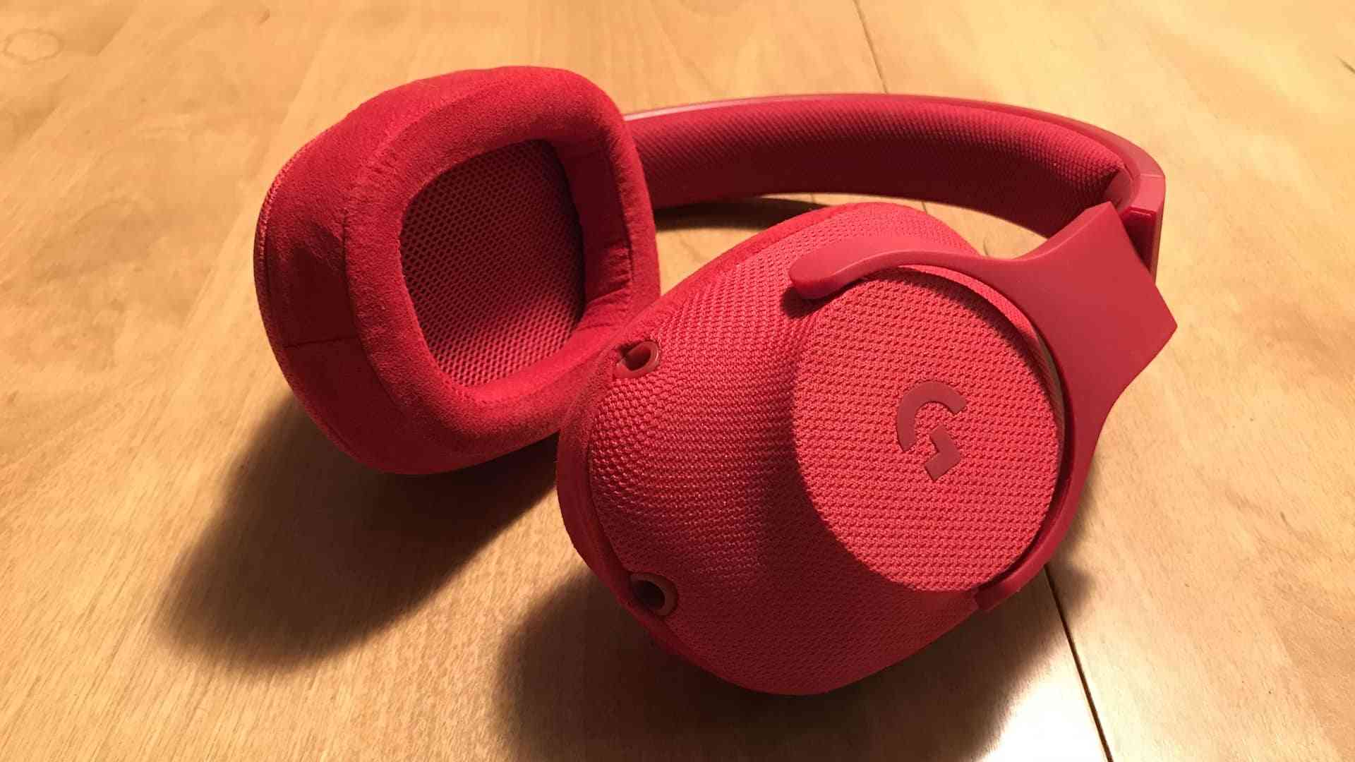 Aesthetically, the G433 has a boatload of swagger. Our sample is red from tip to tail and manages to look more subdued that it ought to. It wouldn’t look out of place on the bus or in your favorite airport lounge. The outsides of the ear cups are covered in fabric that feels nice if a bit cheap, but it’s a big improvement on the trashy plastic used in almost everything these days. That same fabric is on the default ear pads too, but it’s noisy and not very soft, so the included suede-like replacements were very welcome. The rest of the construction is plastic, but it feels really sturdy. Twisting and bending the band doesn’t feel as scary as with other cans, and I wouldn’t hesitate to just chuck these in a backpack unprotected.