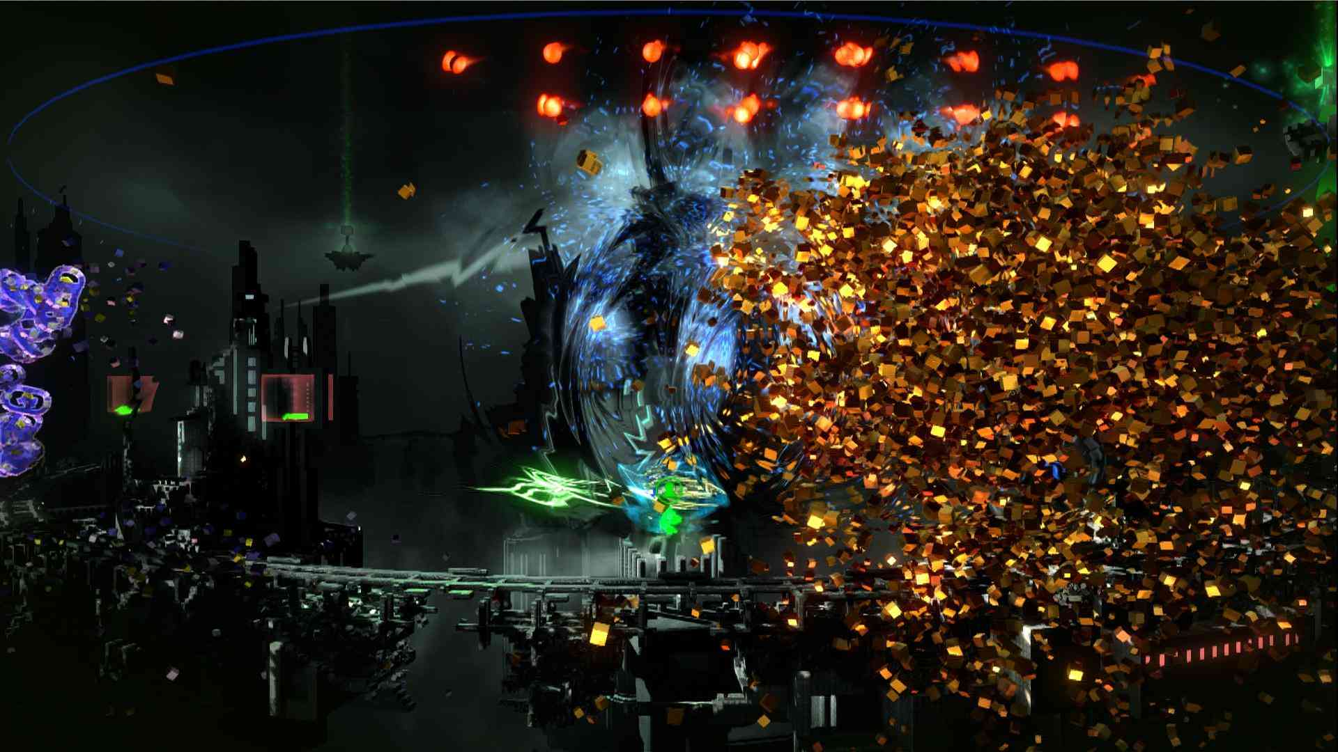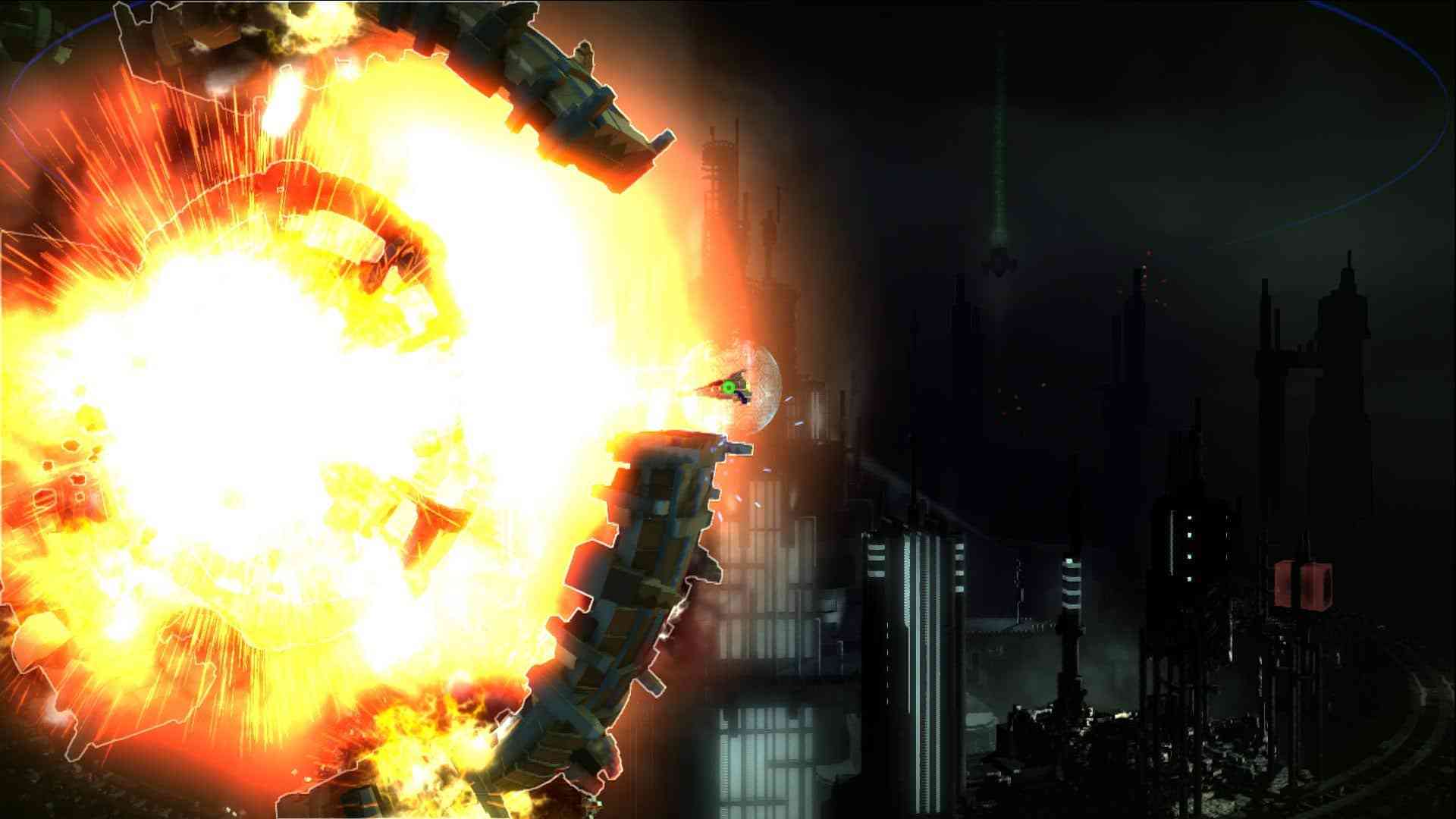 Presentation wise, Resogun is pretty slick. Each level is slightly different (e.g. there are water areas on one and in another you have molten rock shooting out in the air) so there is some variety. What I really enjoyed was that the levels take damage from enemy ship debris and large explosions. It was neat to see the remains of buildings or craters in the ground. Of course where this game really shines though is in the use of particles. Man there is a ‘whole-lot-of-pretty’ going on all at once especially when you destroy any of the five bosses. All of the included eye candy occurs without a single technical hiccup too. As for the sound, it is well suited for the content material. From the techno soundtrack, the in-game announcer, to the sounds of shooting and blasting away, it all just works and makes the game that more enjoyable.