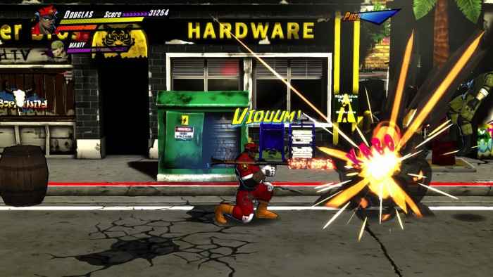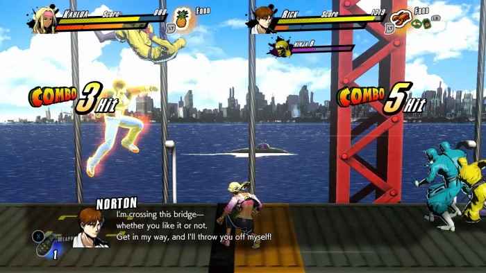Detectives Rick Norton and Douglas Bild return from the first two Rushing Beat games. Their names were changed to Jack Flak and Oozie Nelson in Rival Turf, and Hack and Slash in Brawl Brothers. They weren’t in The Peace Keepers. But they get their original names in Rushing Beat X: Return of Brawl Brothers. The game’s main mode is its story mode. It has tons of cutscenes and predetermined characters for certain sections. There is a free play option, though, where players can go through the levels using any characters they like, without the cutscenes. These modes are great choices for players who like their games story heavy, and players who want to just get to the action.