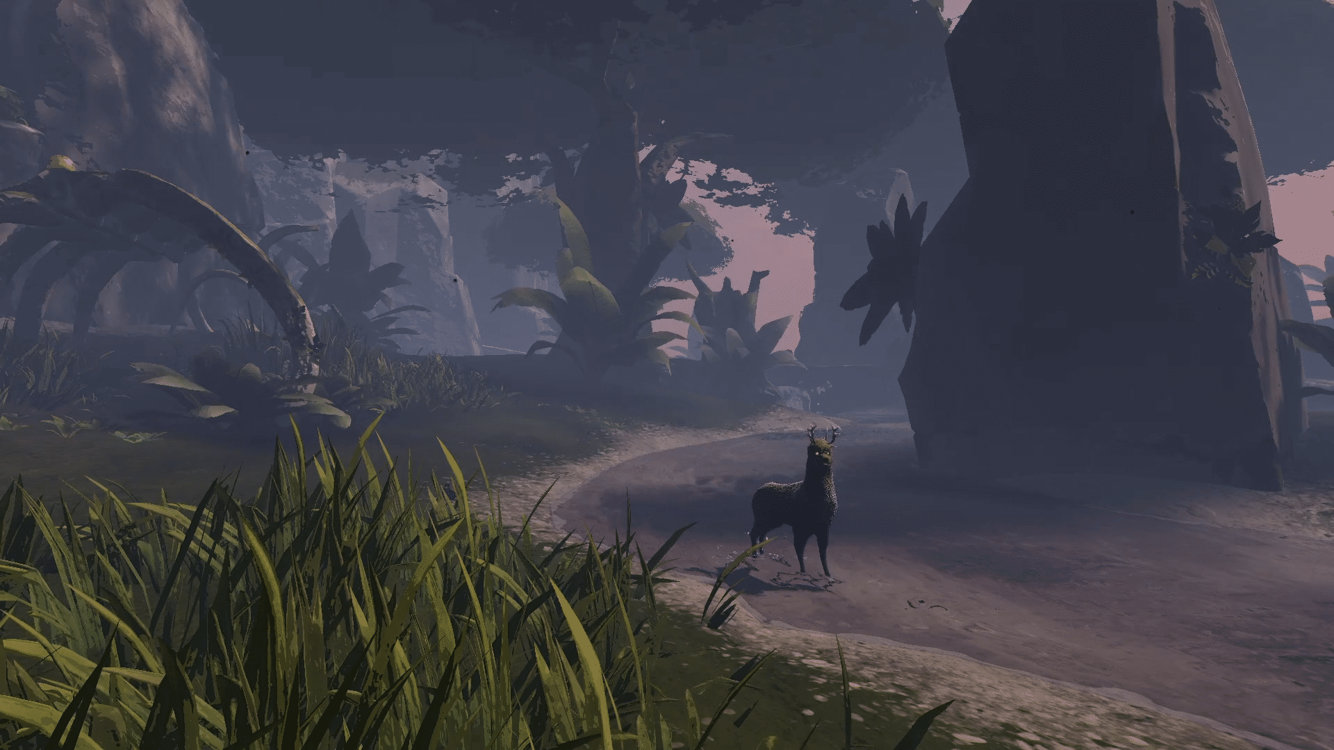There is a variety of flora, some of which serves as food, like berries or mushrooms to eat or herbs you use to heal or provide energy. The flora is also used to make the world feel alive. Fern leaves and tree branches move and dip with the wind or part as you move through them. The denser foliage can also be used as camouflage while hunting or as refuge to hide from larger predators. It really adds a lot to the game when the environment is interactive instead of just set dressings.