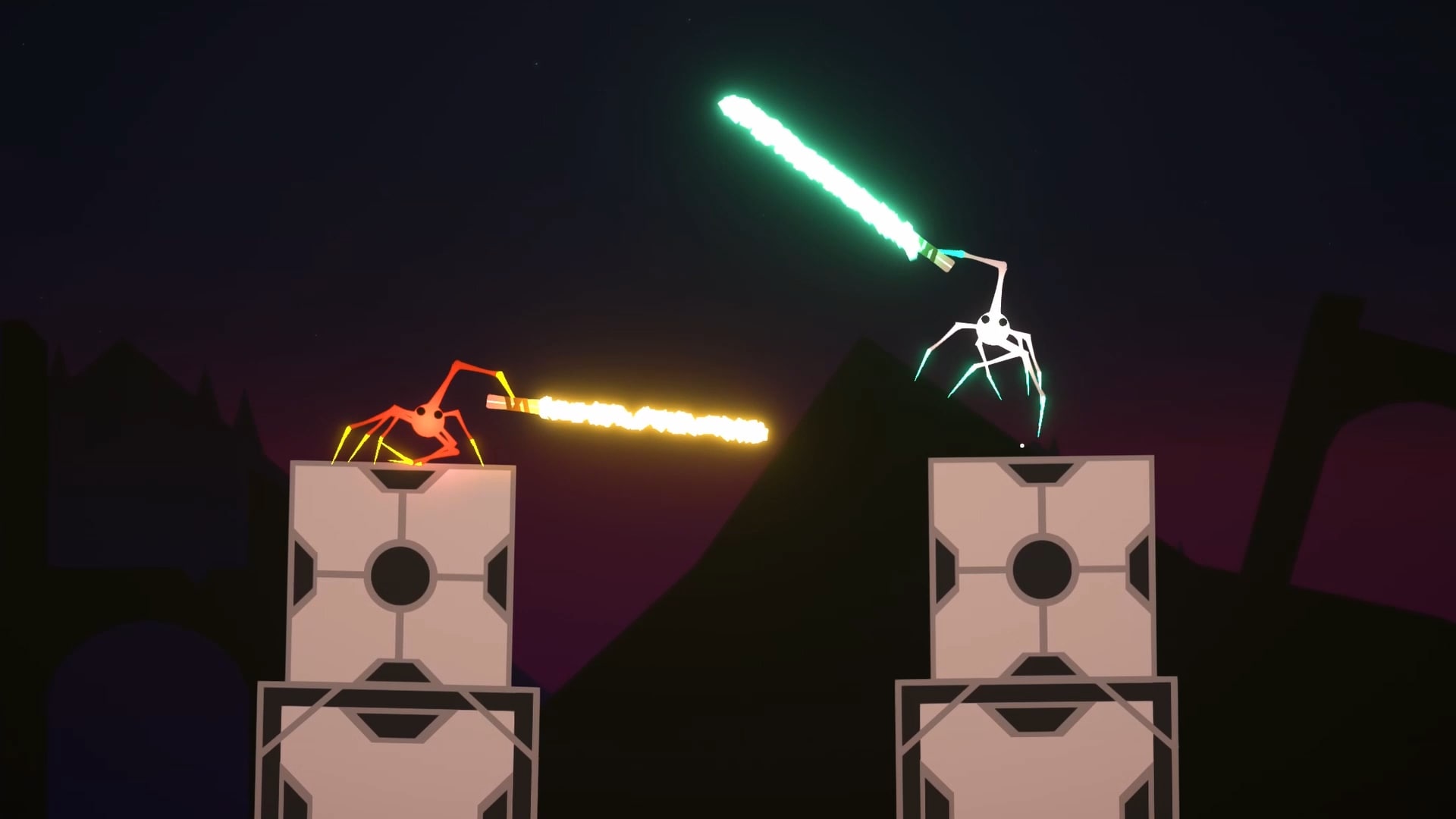 SpiderHeck doesn’t feature a story. This game is all about the fun, over-the-top gameplay. Each player controls a spider in one of many different single-screen arenas. Your objective depends on which game mode you’re in, but you’ll be either fighting against other player-controlled spiders or uniquely designed AI enemies. Your spider doesn’t have any attacks; it can crawl on any surface, jump, and swing Spider-Man style. Around the arena, weapons will randomly spawn. Once you pick up a weapon, you’ll be able to go on the offensive and slay your enemy. There are a ton of different weapons in the game, ranging from Star Wars-inspired light swords, explosives, shotguns, rocket launchers and more. The randomness of the weapon spawns is one of many factors that makes this game so wild.